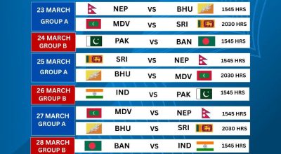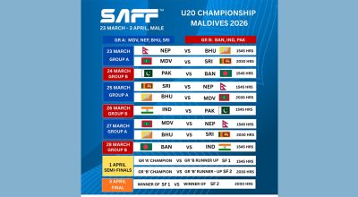 साफ यू–२० च्याम्पियनसिपको तेस्रो संस्करण माल्दिभ्सको मालेमा आजदेखि सुरु हुँदैछ। उद्घाटन खेलमा नेपालले भुटानसँग प्रतिस्पर्धा गर्दैछ। माल्दिभ्सको मालेस्थित राष्ट्रिय रंगशालामा हुने खेल नेपाली समयअनुसार दिउँसो ४ः३० बजे सुरु हुनेछ। धर्मेन्द्र कुँवरले साफ यू–२० च्याम्पियनसिपमा नेपाली टोलीको कप्तानी सम्हाल्दै छन्। खेलमा दुवै टोली विजयी सुरुआतको खोजीमा छन् । यी दुवैले समूह चरणअन्तर्गत समूह ‘ए’ को पहिलो खेल खेल्न लागेका हुन् । प्रतियोगितामा नेपाल र भुटानसँगै अन्य पाँचवटै सदस्य राष्ट्रको सहभागिता छ । समूह ‘ए’ मा नेपाल, भुटान, माल्दिभस र श्रीलंका छन् । त्यसैगरी, समूह ‘बी’ मा भारत, बंगलादेश र पाकिस्तान छन् ।