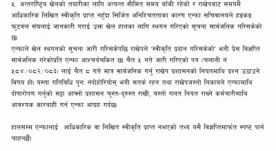 यता एन्फाले चैत ५ गते बिहानदेखि दिउँसोसम्म एन्फाका कर्मचारी राखेप कार्यालयमै उपस्थित हुँदासमेत लिखित स्वीकृति नदिएको एन्फाले जनाएको छ । एन्फाले सोमबार बिहान विज्ञप्ति जारी गर्दै खेल सञ्चालनका लागि दशरथ रंगशालाको मर्मत सम्भारदेखि आवश्यक स्वीकृति समयमै नपाएको दाबी गरेको छ । विवादको मुख्य कारण बनेको विषय एन्फाको साधारण सभा तथा निर्वाचन प्रक्रिया हो। एन्फाले २०८२ पौष १६ गते कार्यसमिति बैठकको निर्णयअनुसार अर्डिनरी कंग्रेस आयोजना गर्ने तयारी गरिरहेको थियो। तर राखेपले आफ्नो विधान र कानुनअनुसार आवश्यक संशोधन नगरी प्रक्रिया अघि बढाउन नहुने भन्दै एन्फालाई पत्राचार गरेको थियो। सामान्यतः यो कदमपछि एन्फा–राखेप विवाद सुरु भएको देखिन्छ।