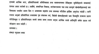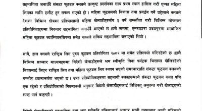 काठमाडौं। संकटा फुटबल क्लबले विदेशी खेलाडीहरुले श्रम स्वीकृति बिना पर्यटक भिसामा खेलिरहेको विषयलाई लिएर राष्ट्रिय लिग तथा महिला फुटबल लिग स्थगित भएकोप्रति गम्भीर ध्यानाकर्षण जनाएको छ।